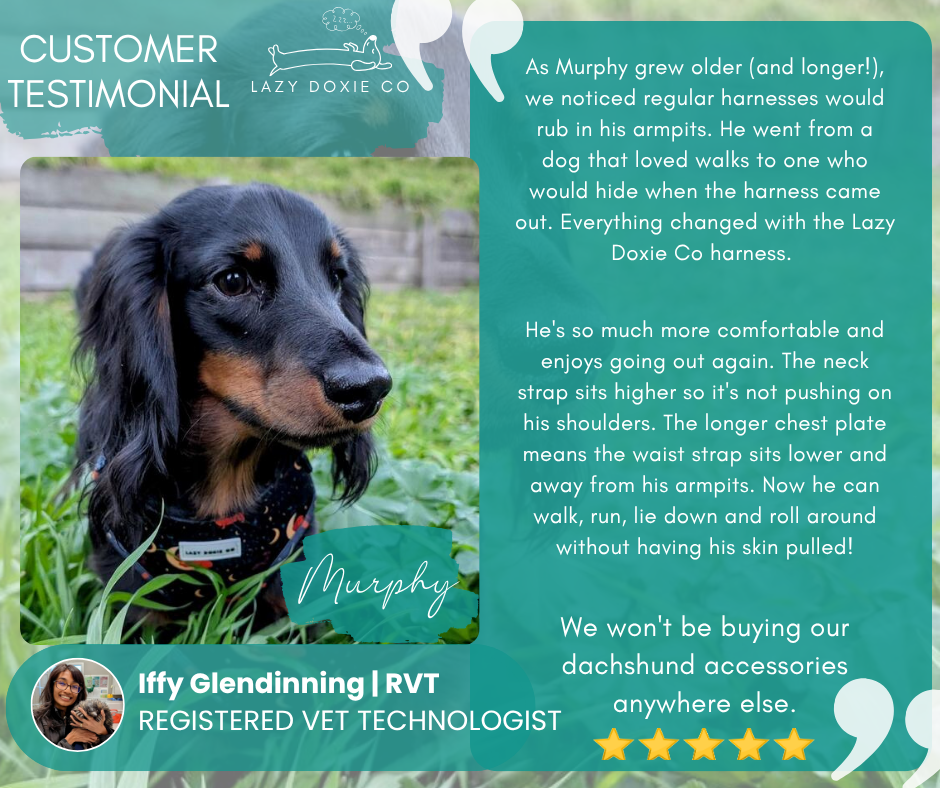 Lazy Doxie Company youβve officially spoiled us rotten! My order was upsized from just a harness and lead to include bows, a bandana, and a poop bag holderβ¦ talk about feeling fancy! Our 8-month-old Mini Doxie, Maisy, now struts around like she owns the neighbourhood and gets compliments everywhere we go. Even my daughter said itβs the best quality harness weβve ever owned. Weβre now lifelong fans and plan to collect every set!