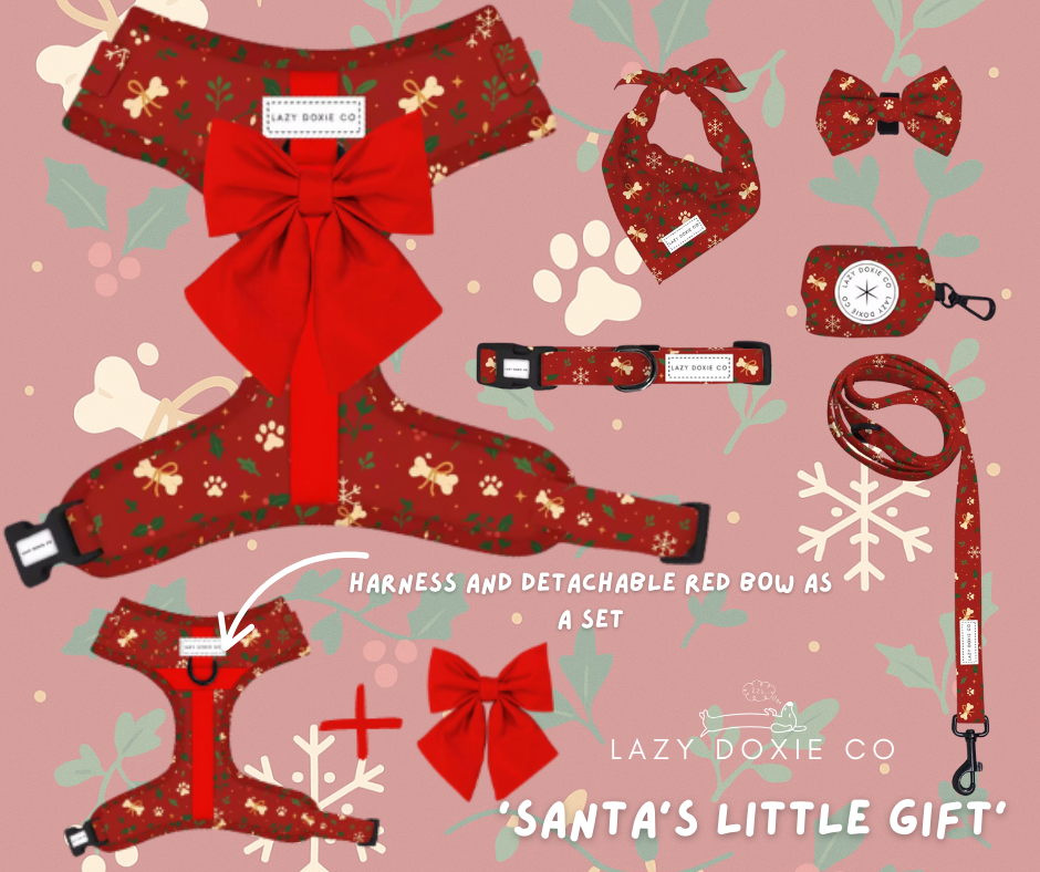 Our exclusive Christmas 'Santa's Little Gift' set in a gorgeous red print with a cross ribbon design to appear like a gift. Santa's Little Gift Harness comes with a plain red bow to finish to present look. The collection is now here and comes in all sizes XXS-M.