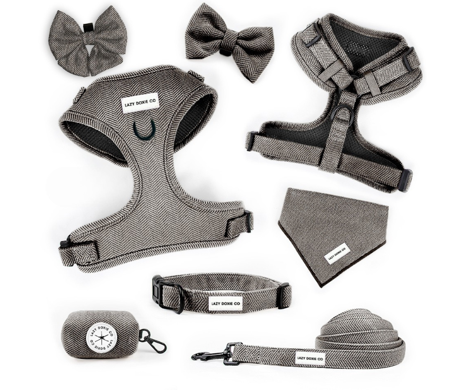 Dapper, timeless, and pawfectly sophisticated – meet our Charcoal Tweed Harness Set ' Daxedo Noir'. Designed in a neutral herringbone pattern, this set is the ultimate wardrobe staple for every sausage who loves to look sharp while staying comfy.