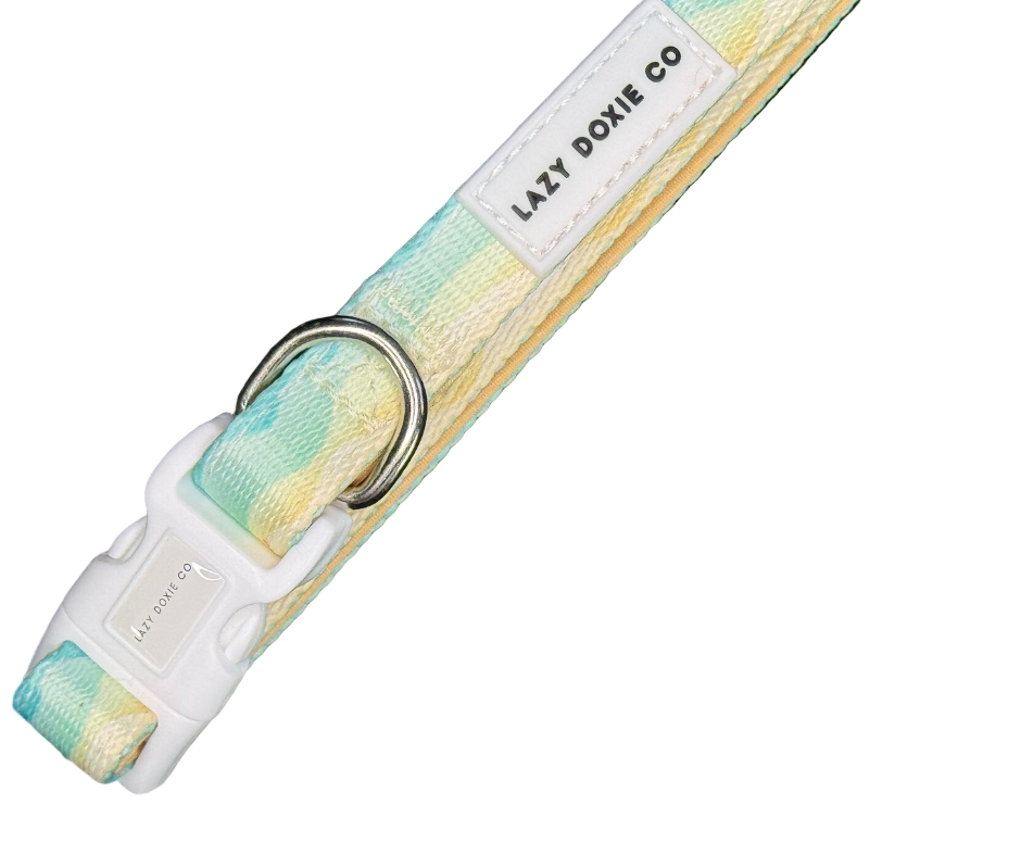 Expertly designed for convenience and comfort, our Collar in our exclusive 'Surf's Pup' design features an adjustable quick release clip, padded liner, and a metal loop for attaching leads and ID tags. Ensure your pet's safety and style with this durable collar.